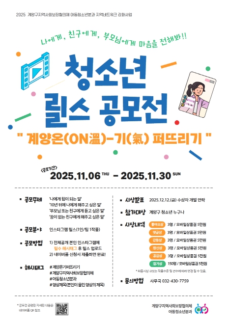 [파이낸셜경제=김기보 기자] 인천 계양구지역사회보장협의체 아동청소년분과는 청소년의 정신적·정서적 건강 증진과 건강한 또래문화 형성을 위해 ‘계양 온(ON溫)-기(氣) 퍼뜨리기’ 청소년 릴스 공모전을 개최한다고 밝혔다.