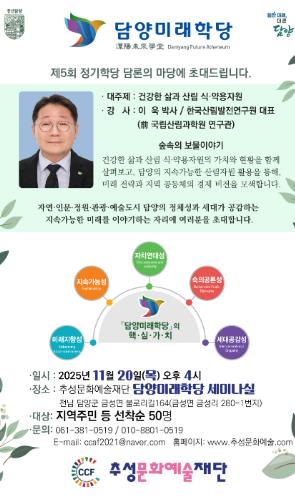 [파이낸셜경제=김예빈 기자] 추성문화예술재단이 운영하는 담양미래학당은 오는 11월 20일 오후 7시, 담양군 금성면에 위치한 담양미래학당 세미나실에서 제5회 정기학당 담론마당을 개최한다.