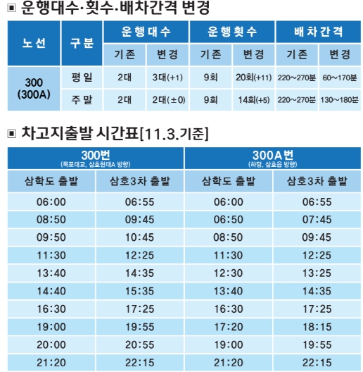 이번 노선 개편으로 11/3일부터 목포시는 목포대교와 삼호현대아파트를 경유하는 300번, 하당과 삼호읍을 오가는 300A번 시내버스를 운행한다.