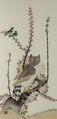 | ▲ 광양시 제25회 광양매화축제서 엄재권 화백 민화 특별전 개최 관광과(부엉이와 매화). |