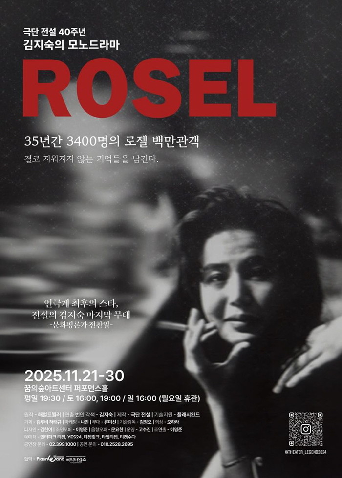 [파이낸셜경제=김영란 기자] 극단 전설 40주년 기념작이자 배우 김지숙의 마지막 공연인 모노드라마 〈로젤〉이 오는 11월 21일부터 30일까지 꿈의숲아트센터 퍼포먼스홀에서 막을 올린다. 35년간 3,400회 이상 공연되며 백만 명이 넘는 관객을 울린 이 작품은 여성의 주체성과 인간성의 회복을 그린 한국 연극사의 대표작으로 꼽힌다.