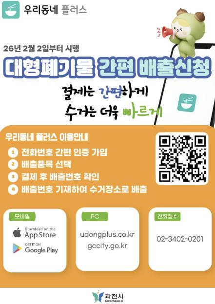 이번 시스템 도입으로 시민들은 대형폐기물 배출 시 스티커 판매소를 직접 방문하지 않아도, 스마트폰 앱이나 과천시 홈페이지를 통해 배출 신청부터 수수료 결제까지 한 번에 처리할 수 있게 된다. 종이 스티커를 구매해 부착하던 방식도 기존과 동일하게 계속 유지된다.