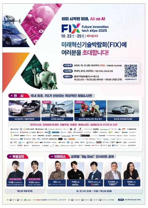 [파이낸셜경제=김지훈 기자] ‘이미 시작된 미래, All on AI’를 주제로 ‘2025 미래혁신기술박람회’가 10월 22일부터 25일까지 4일간 대구 엑스코에서 열린다.