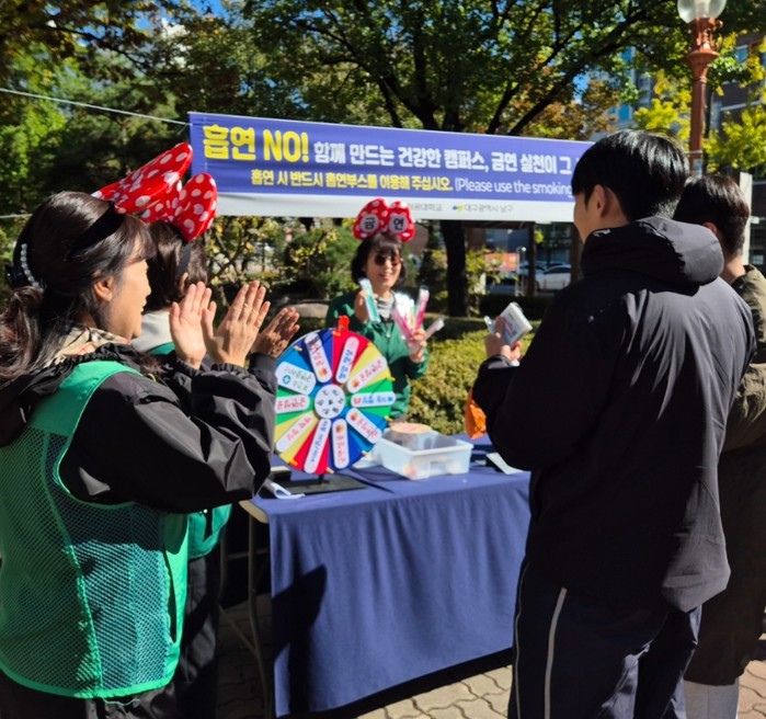 남구보건소는 10월 한 달 동안 대명2동과 봉덕2동 새마을부녀회로 구성된 금연정책 주민홍보단인 ‘우리마을누비단’과 함께 대구교육대학교, 영남이공대학교 등 관내 대학교에서 신종담배 유해성 인식 확산 캠페인을 진행했다.