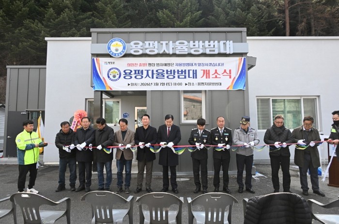 [파이낸셜경제=조성환 기자] 용평자율방범대(대장 박범종)는 지난 3월 7일 용평면 장평리 376-3번지에서 내빈, 방범대원 등 50여 명이 참석한 가운데 용평자율방범대 초소 개소식을 개최했다. 용평자율방범대 초소는 2024년 1월 장평 LPG충전소 가스폭발 사고로 전소된 이후 같은 해 5월 제1회 추가경정예산을 통해 재건축 예산을 확보하고 관련 행정절차와 공사를 추진해 2025년 10월 준공 및 사용승인을 완료했다. 박범종 용평자율방범대장은 ‘새롭게 마련된 초소를 거점으로 지역 내 범죄 예방을 위한 순찰 활동과 청소년 선도 활동 등을 강화해 지역 치안 사각지대 해소에 적극 나설 계획’이라고 밝혔다.