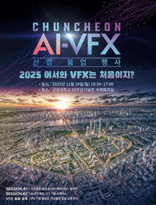 [파이낸셜경제=조성환 기자] 춘천시는 2025년 11월 24일 강원대학교 60주년 기념관 국제 회의실에서 ‘춘천 AI-VFX 산업붐업행사 – 2025 어서와! VFX는 처음이지?’를 개최한다고 밝혔다.