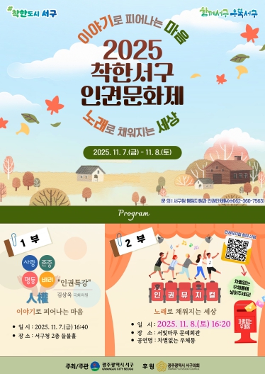 [파이낸셜경제=김예빈 기자] 광주광역시 서구가 주민 참여 기반 인권문화 정착에 박차를 가한다. 서구는 오는 7일과 8일 이틀간 ‘이야기로 피어나는 마음, 노래로 채워지는 세상’을 주제로 ‘2025 착한서구 인권문화제’를 개최한다.