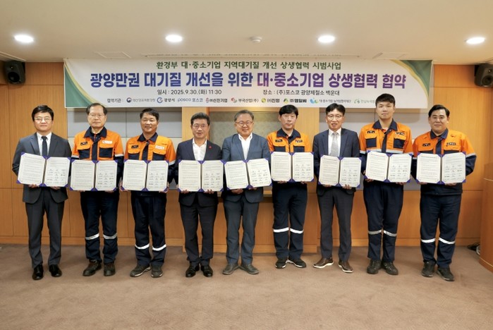 [파이낸셜경제=김예빈 기자] 광양시와 영산강유역환경청은 9월 30일 국내 최대 철강업체인 ㈜포스코 광양제철소와 협력업체 4개사가 광양만권 지역 대기질 개선을 위해 ‘광양만권 대․중․소기업 지역 대기질 개선 상생협력 협약’을 체결했다고 밝혔다.