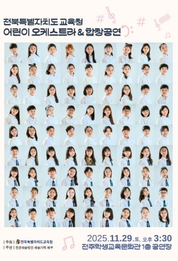 [파이낸셜경제=김예빈 기자] 전북특별자치도교육청은 오는 29일 전주학생교육문화회관 1층 공연장에서 ‘2025 전북특별자치도교육청 어린이 오케스트라 & 합창공연’을 개최한다.