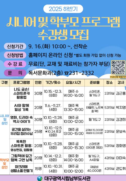 | ▲ 대구남부도서관, 하반기 시니어 및 학부모 프로그램 수강생 모집 |