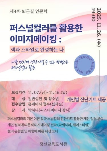 [파이낸셜경제=조성환 기자] 정선교육도서관은 11월 26일, 고등학생과 일반 성인을 대상으로 제3차 퇴근길 인문학 “퍼스널컬러를 활용한 이미지메이킹 : 색과 스타일로 완성하는 나” 강연을 운영한다.