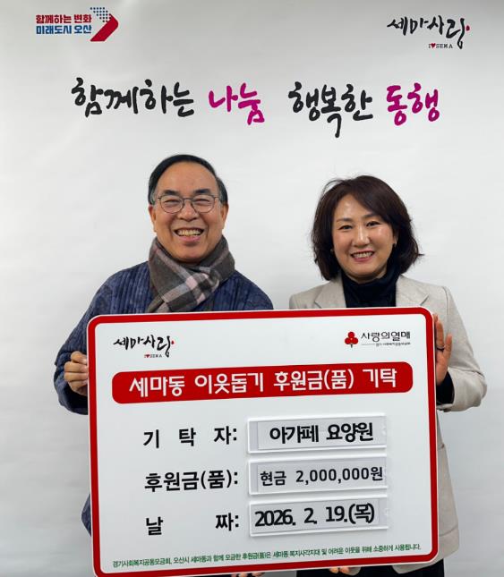 | ▲ 오산시 세마동 행정복지센터, 아가페 요양원으로부터 취약계층 지원 성금 200만원 기탁받아 |