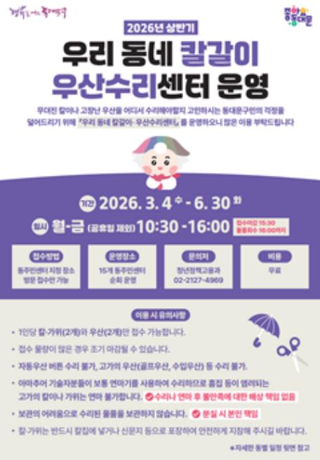 주민 체감도가 큰 서비스는 ‘우리 동네 칼갈이·우산수리센터’다. 요즘은 동네에서 칼갈이를 맡길 곳을 찾기 쉽지 않다. 구는 이 공백을 메우기 위해 동 주민센터를 하루씩 순회하며 무뎌진 칼과 가위는 날을 세워주고, 고장 난 우산은 살(뼈대) 교체 등 간단 수선을 돕는다. 운영 시간은 평일 오전 10시 30분~오후 4시, 비용은 무료다. 우산은 수리 시간이 비교적 길어 접수 물량이 많으면 조기 마감될 수 있다고 구는 안내했다.