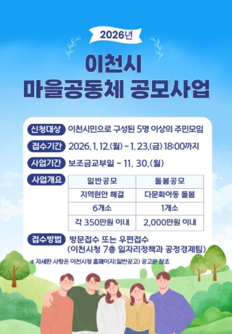 신청 기간은 1월 12일부터 1월 26일까지이며, 신청 방법과 제출서류 등 자세한 사항은 이천시 누리집 공고문을 통해 확인할 수 있다.