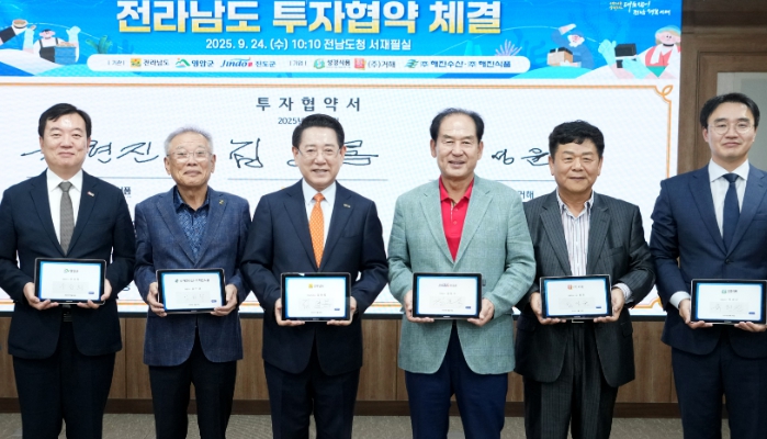 [파이낸셜경제=김예빈 기자] 전라남도는 24일 도청 서재필실에서 ㈜성경식품, ㈜해진수산, ㈜해진식품 등 3개사와 투자금액 총 1천34억 원 규모의 투자협약을 했다고 밝혔다. 이번 투자로 302명의 신규 고용 창출도 기대된다.