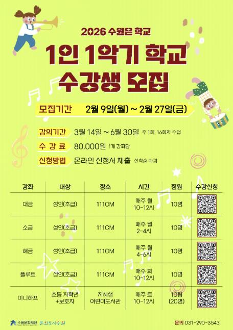 수원문화재단 관계자는 “‘1인 1악기 학교’는 악기 초보자도 부담 없이 시작할 수 있도록 모든 강좌를 초급 과정으로 구성했다”며, “악기 수업이 새로운 취미를 발견하고 문화예술을 가까이에서 즐길 수 있는 기회가 될 것”이라고 전했다.