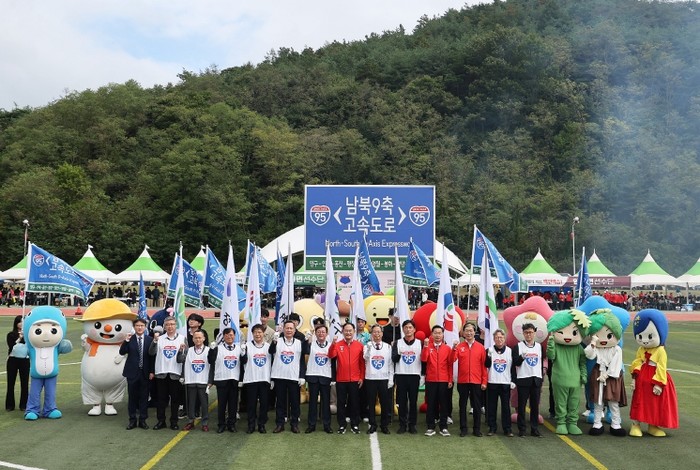 행사는 ‘남북9축, 함께 잇다’ 슬로건 아래 강원·경북10개 시‧군 대표단이 운동장 양 끝에서 동시에 출발, 중앙에 위치한 제막무대에서 하나로 모여 ‘남북9축 고속도로’ 표지판을 공동 제막하는 순으로 진행됐다.