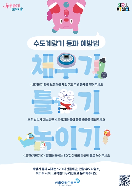 이회승 서울아리수본부장은 “지난해 동파 취약지역을 중심으로 사전 예방 활동을 펼치고, 시민들을 대상으로 동파예방 수칙을 적극 홍보한 결과 동파 건수가 전년 대비 33% 감소했다”라며 “올해는 한파 예보 단계별 안내와 상황실 운영, 취약지역 집중 관리, 생활 속 예방수칙 홍보를 강화해 수도계량기 동파를 효과적으로 예방하겠다”고 말했다.