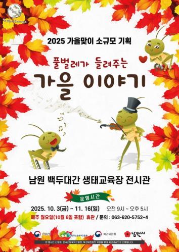 [파이낸셜경제=김예빈 기자] 남원시는 2025년 가을을 맞아 오는 10월 3일부터 11월 16일까지 백두대간 생태교육장과 지리산 허브밸리를 연계하여 각각 가을을 대표하는 풀벌레 등 다양한 곤충 전시하는 『풀벌레가 들려주는 가을이야기』, 그리고 다가오는 할로윈을 맞아 절지동물을 주제로 한 『미리 만나는 할로윈 : 오싹오싹 절지동물』 기획전을 진행한다.