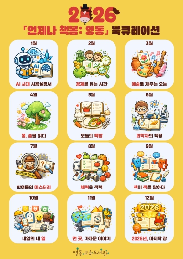 [파이낸셜경제=김기보 기자] 영동교육도서관은 2026년 1월부터 12월까지 '언제나 책봄: 영동' 북큐레이션을 운영한다. 매월 주제에 맞는 대상별 추천도서 32권을 전시하여 도서관 이용자에게 다양한 독서 경험을 제공하기 위함이다.