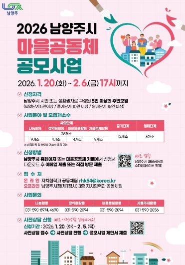 [파이낸셜경제=김기보 기자] 남양주시는 1월 20일부터 2월 6일까지 ‘2026년 마을공동체 공모사업’참여 공동체를 공개 모집한다.