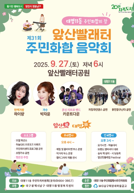 앞산빨래터 주민화합 음악회는 지역 주민들이 함께 어울리고 소통하는 문화축제로, 올해로 31회를 맞아 더욱 풍성한 무대와 다채로운 부대행사가 마련되어 있다.