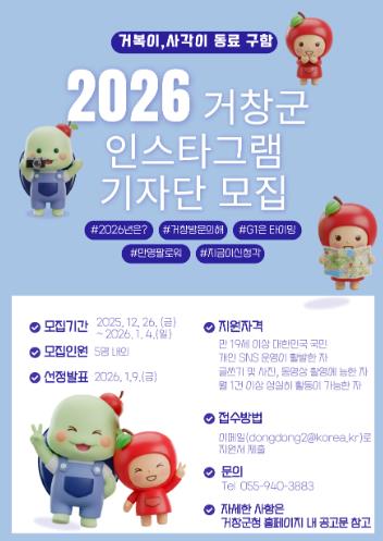 [파이낸셜경제=김예빈 기자] 거창군은 지역 관광자원의 매력을 생생하게 전달하고 온라인 홍보를 강화하기 위해 ‘2026년 거창군 인스타그램 기자단’을 모집한다고 26일 밝혔다.