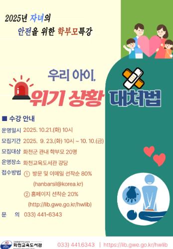 [파이낸셜경제=조성환 기자] 화천교육도서관은 10월 21일 10시, 화천군 관내 학부모를 대상으로 학부모 소통(疏通) 프로그램 ‘우리 아이, 위기 상황 대처’ 특강을 운영한다.