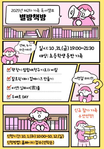 [파이낸셜경제=조성환 기자] 삼척교육문화관은 10월 31일 가족과 함께 도서관에서 특별하고 즐거운 추억을 만들 수 있는 ‘2025년 제2차 독서캠프 ‘별밤책밤’을 운영한다.