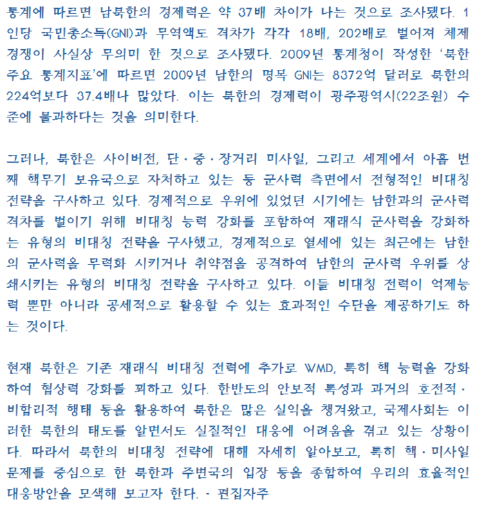 결국 북한은 회복되지 않는 경제난 가운데 무기 개발과 생화학무기, 핵ㆍ미사일 개발 등 대량살상이 가능한 전략무기체계 구축을 추진하고 군사력에 기초한 강성대국 건설을 내세우고 있으며, 이는 한반도 통일을 위한 속전속결형 공세적 군사전략과 미국에 대응하기 위한 대량살상무기 개발로 비대칭 전략을 병행하려는 의도가 있는 것이다.