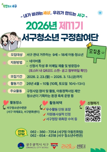 서구는 3월13일까지 서구에 거주하거나 관내 학교에 재학 중인 9세부터 18세까지 아동·청소년 80명을 모집한다. 참여를 희망할 경우 서구청소년수련관 누리집의 관련 서류를 준비해 서구청 양성아동복지과에 방문하거나 전자우편으로 제출하면 된다. 네이버폼으로도 신청 가능하다.