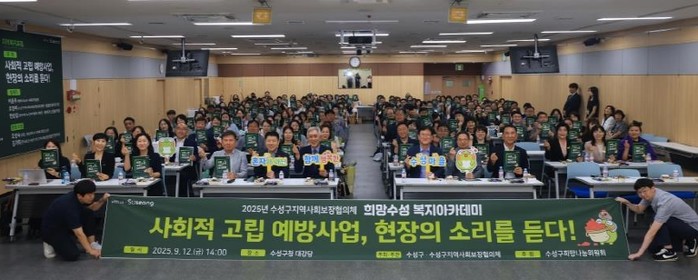 [파이낸셜경제=김지훈 기자] 대구 수성구는 지난 12일 수성구청 대강당에서 협의체 위원, 사회복지기관 및 시설 종사자, 지역 주민 등 200여 명이 참여한 가운데 ‘사회적 고립 예방사업, 현장의 소리를 듣다!’를 주제로 수성구지역사회보장협의체 2025년 '희망수성 복지아카데미'를 성황리에 개최했다.