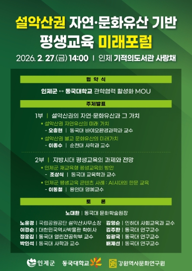 한편, 협약식과 함께 2025년 인제군–동국대 협력사업의 일환으로 '설악산권 자연·문화유산 기반 평생교육 미래포럼'이 개최된다.