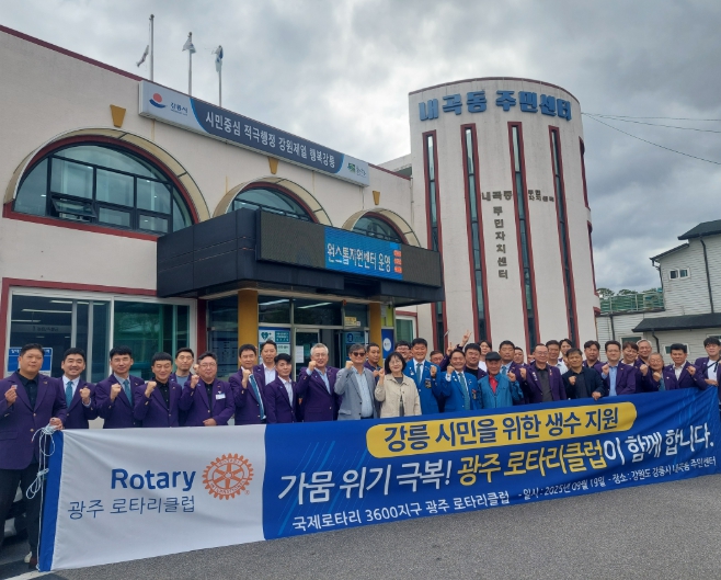 [파이낸셜경제=조성환 기자] 국제로타리3600지구 광주로타리클럽(회장 김영근)은 19일 가뭄으로 힘든 시간을 보내고 있는 강릉 내곡동 주민들을 위한 생수(500㎖) 9,600병을 내곡동주민센터에 전달했다.