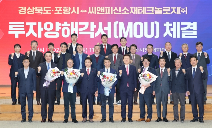 [파이낸셜경제=김지훈 기자] 포항시와 경상북도는 19일 포항시청 대회의실에서 씨앤피신소재테크놀로지㈜와 5,000억 원 규모의 투자양해각서(MOU)를 체결했다.