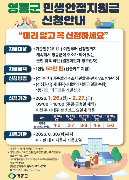 지급 대상은 지급기준일인 1월 1일부터 신청일 현재까지 영동군에 주민등록을 두고 거주 중인 군민이다.