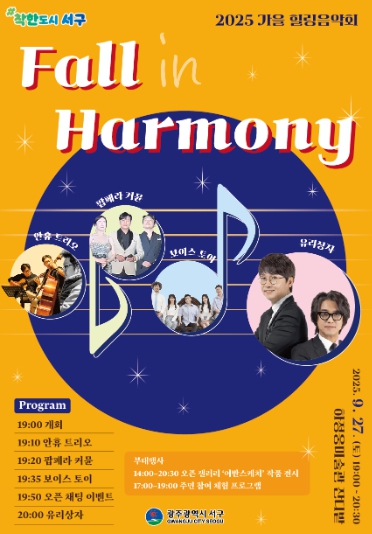 [파이낸셜경제=김예빈 기자] 광주광역시 서구는 오는 27일 오후 7시 농성동 하정웅미술관 앞 잔디광장에서 ‘2025 가을 힐링음악회 – 폴 인 하모니(Fall in Harmony)’를 개최한다.
