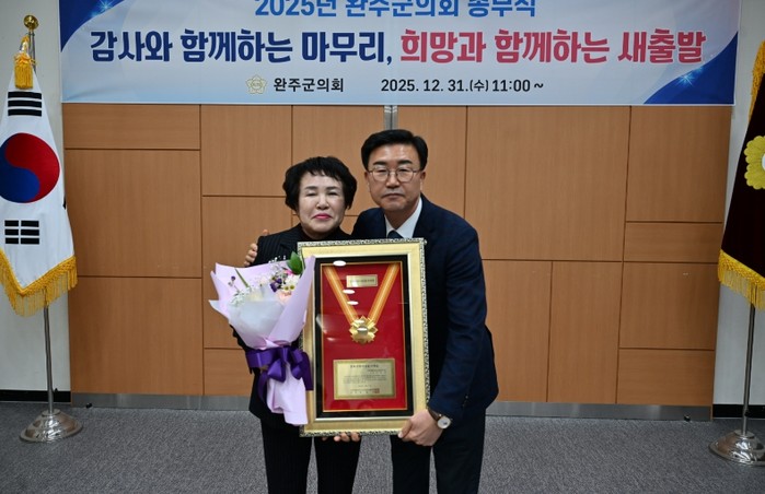 [파이낸셜경제=김예빈 기자] 완주군의회 이경애 의원이 지난달 31일, 완주군의회 문화강좌실에서 열린 완주군의회 2025년도 종무식에서 전북 지방의정봉사상을 수상했다.