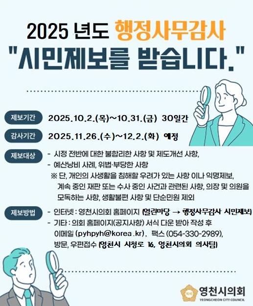 [파이낸셜경제=김지훈 기자] 영천시의회는 2025년도 행정사무감사를 앞두고 10월 31일까지 시민제보를 받는다.