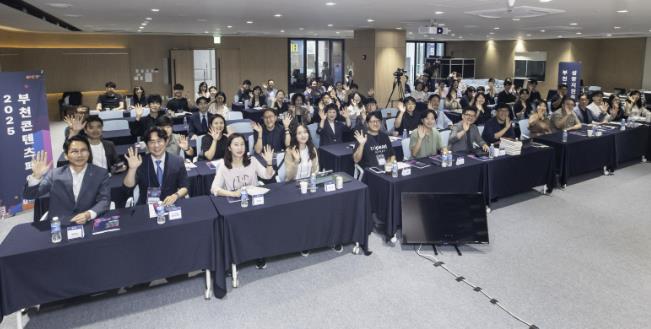 | ▲ ‘2025 부천 콘텐츠페어’에 참여한 기업과 투자사·유관기관 관계자들이 단체 사진을 촬영하고 있다. |