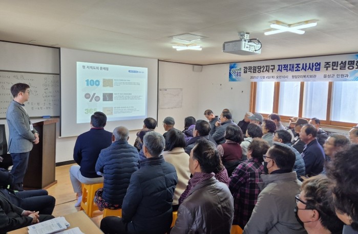 [파이낸셜경제=김기보 기자] 음성군은 4일 감곡면 원당2리 복지회관에서 2026년도 591필지(75만5146㎡) 감곡원당2지구 지적재조사사업에 대한 주민설명회를 개최했다.