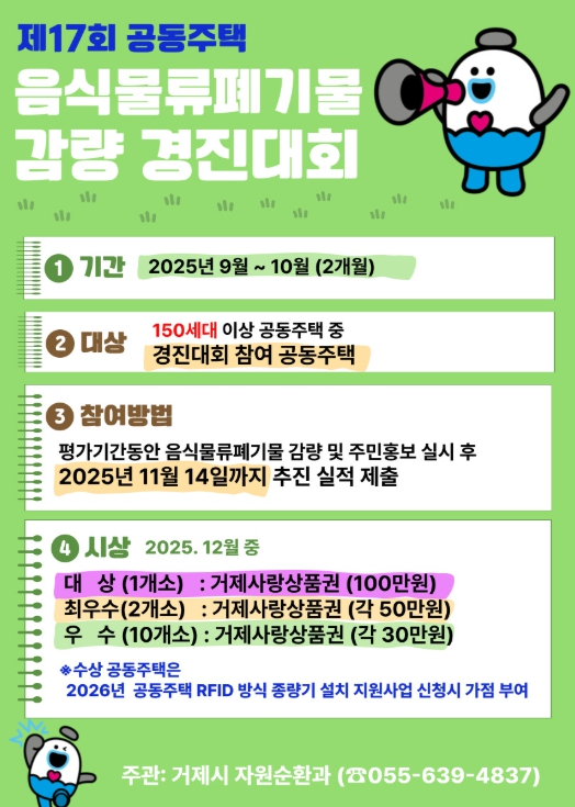 [파이낸셜경제=김예빈 기자] 거제시는 관내 150세대 이상 공동주택을 대상으로 음식물류 폐기물 감량 경진대회를 개최한다고 밝혔다.