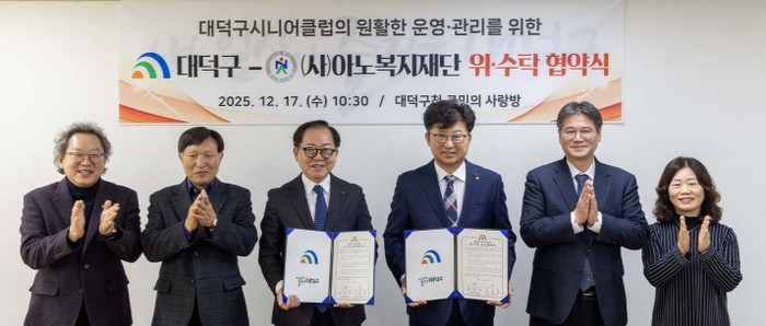 [파이낸셜경제=김영란 기자] 대전 대덕구는 17일 구청 구민의 사랑방에서 사단법인 아노복지재단과 대덕구 시니어클럽 위탁 운영 협약을 체결했다.