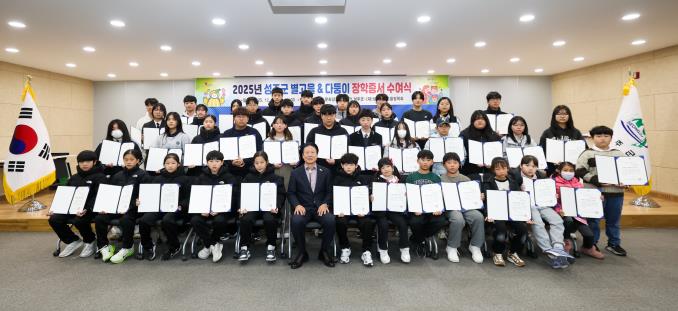 [파이낸셜경제=김지훈 기자] 성주군과 (재)성주군별고을장학회는 지난 12일 예체능 분야에서 뛰어난 성과를 거둔 학생들을 격려하고 저출생에 대응하여 출산을 장려하는 사회적 분위기를 확산시키고자 '2025년 성주군 별고을 & 다둥이 장학증서 수여식'을 동시 개최했다.