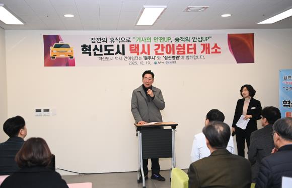 [파이낸셜경제=조성환 기자] 원주시는 혁신도시 내 택시 종사자들의 근로 여건 개선과 복리 증진을 위해, 삼산병원에 ‘혁신도시 택시 간이쉼터’를 조성하고 10일 오전 11시 개소식을 열었다.