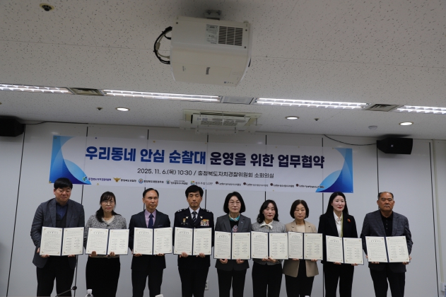 이날 △자치경찰위원회는 순찰대 운영예산 수립 및 관계기관 협력 지원 △충북경찰청은 순찰대 임무 발굴, 지구대·파출소 거점 지원, 범죄예방 교육 △재향경우회는 퇴직 경찰관 대상 사업홍보 및 참여 독려 △시니어클럽은 참여자 모집·관리, 임금 지급 및 안전교육을 담당키로 협약했다.