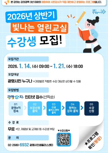 [파이낸셜경제=김기보 기자] 광명시 인생플러스센터는 오는 14일부터 21일까지 시민이 기획하고 운영하는 ‘2026년 상반기 빛나는 열린교실’의 수강생 230명을 모집한다.