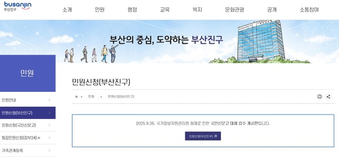 부산진구 관계자는 “국민신문고 복구까지 최소 1개월 이상 소요될 것이라는 정부 발표에 따라 구민 불편 해소를 위해 신속하게 온라인 민원창구를 마련했다”며 “안정적인 민원서비스 제공을 위해 앞으로도 최선을 다하겠다”고 말했다.