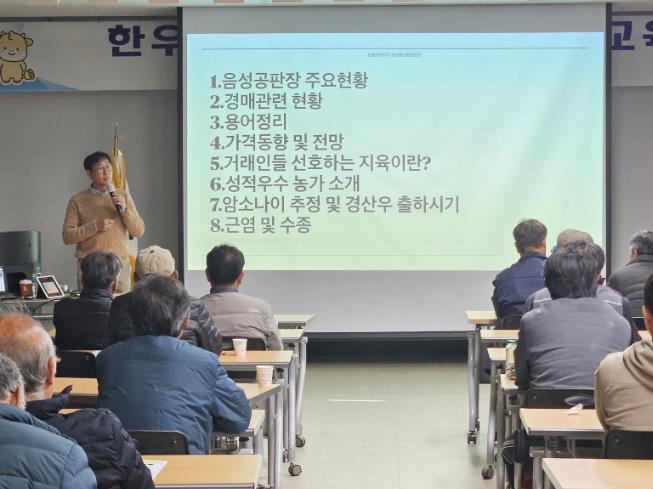 교육은 권기호 지부장의 인사말과 강사 소개로 시작됐으며, 음성축협 소속 김성환 강사가 △시장 가격 형성 구조 이해 △고급육 생산을 위한 사양관리 기술 △출하 시기 결정 전략 △품질 관리 포인트 등 실무 중심의 내용을 설명했다.