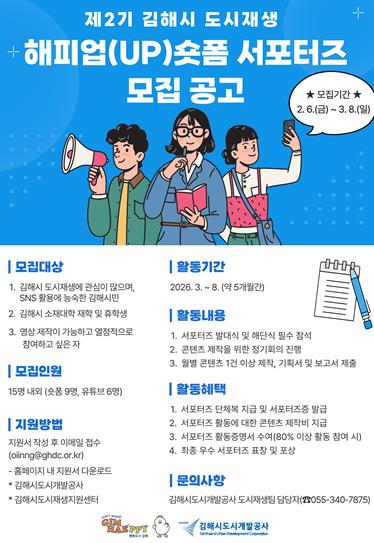 [파이낸셜경제=김예빈 기자] 김해시도시개발공사(이하 공사)는 오는 3월 8일까지 ‘제2기 김해시 도시재생 해피업(UP)숏폼 서포터즈’를 모집한다.